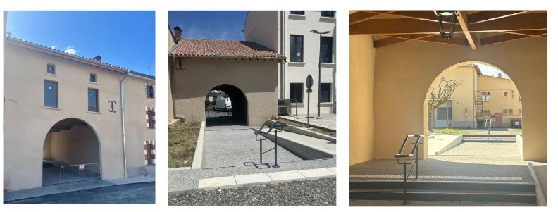 Deux grandes arcades ont été créées sur les deux façades pour libérer un passage qui va permettre d'assurer la transition entre la place de la Vierge, le parking et l'entrée arrière de la Mairie (accessible PMR) ainsi que la salle du foyer rural (salle des fêtes).