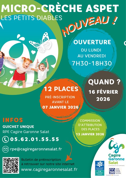 Dès le 16 février 2026 la micro-crèche « Les Petits Diables » située à Aspet sera ouverte en continue cinq jours par semaine. Les pré-inscriptions doivent se faire avant le 07 janvier 2026.