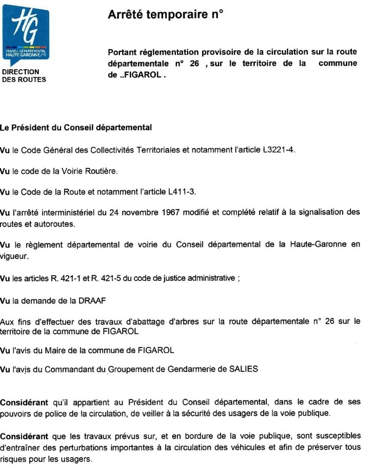 Arrêté portant règlementation provisoire de la circulation sur la route départementale n°26 sur le territoire de la commune de Figarol